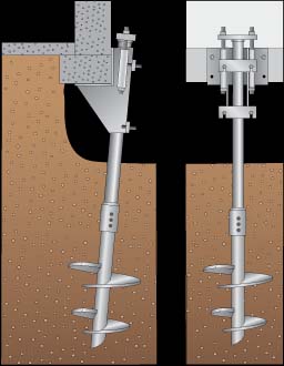 Helical piers use screw piles with steel shafts. The lead section, with one or more helixes attached, provides the needed bearing capacity. The piers are screwed into the ground with a hydraulic torque motor.